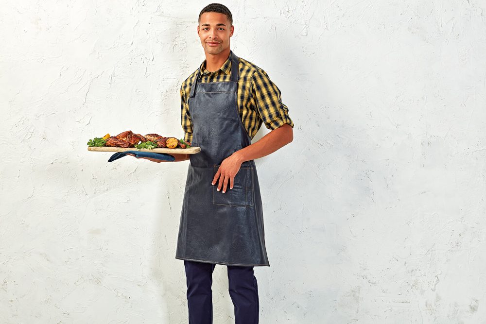 Tilpass denne elegante faux leather-apronen med din egen logo eller design for å gjøre et personlig preg.