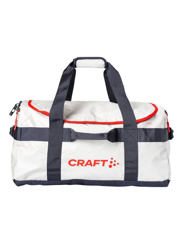 Denne duffelbagen med logotrykk har 70 liter plass, vannavstøtende glidelåser og justerbare skulderstropper.