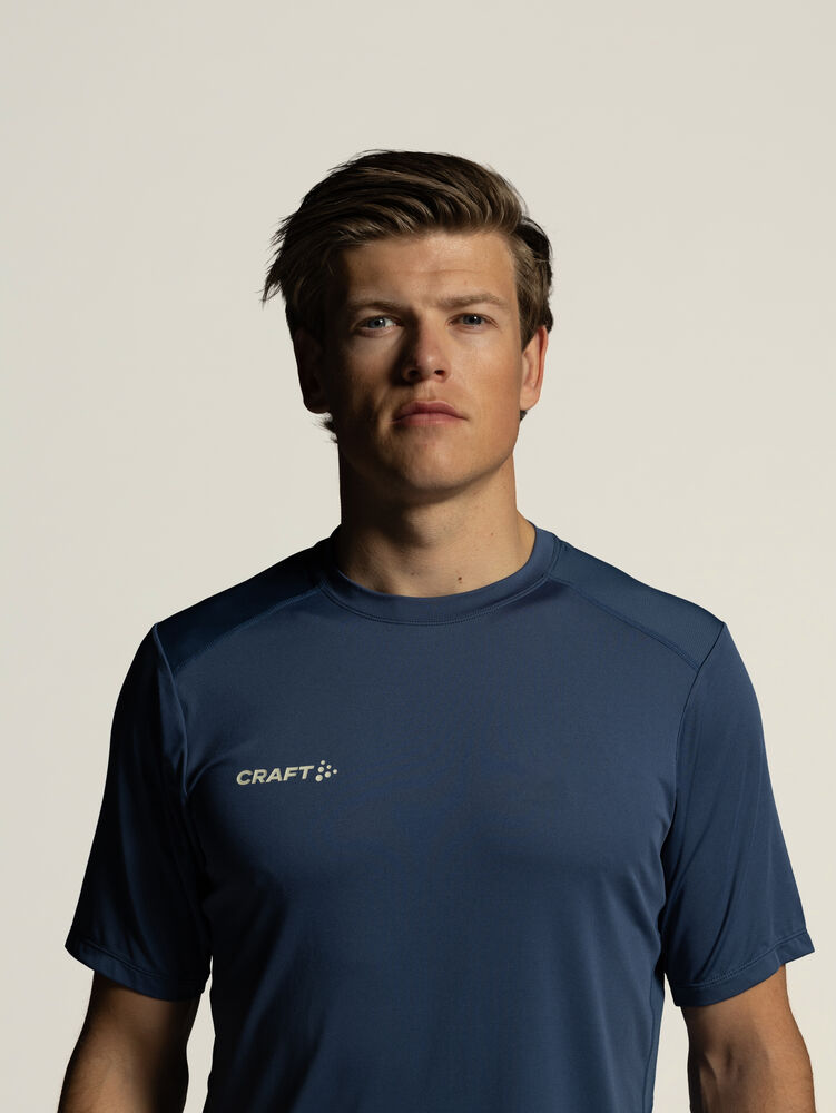 T-skjorten har et ergonomisk design som følger kroppens naturlige bevegelser. Det elastiske materialet gir høy bevegelighet og lar deg utføre øvelser uten begrensninger. Normal passform gir et balansert snitt som sitter pent uten å stramme, og gjør plagget komfortabelt også ved lengre treningsøkter.