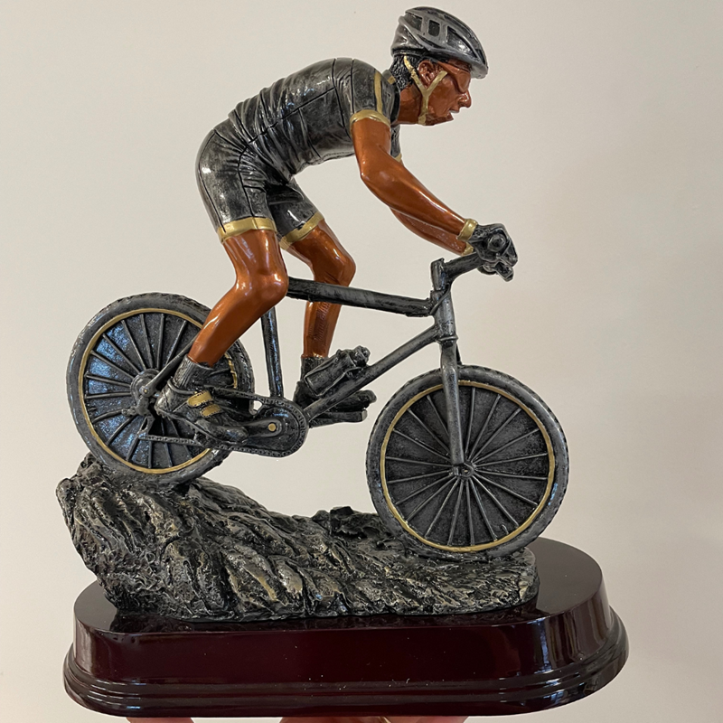 Statuett med Sykkelrytter i resin på sokkel i tre. Den perfekte premie for sykkel konkurranser eller som en heders- utmerkelse til de som fortjener en ekstra oppmerksomhet.